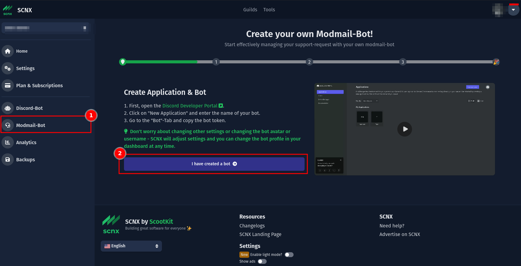 Öffne das SCNX Dashboard und wähle den Server aus, für den du den Modmail-Bot erstellen willst. Als Nächstes wähle "Modmail" in der Seitenleiste aus. Du wirst ein Tutorial finden, wie man den Discord Bot erstellen sollte. Wenn du dieser Anleitung gefolgt bist, kannst du das Video überspringen, indem du auf den "Ich habe einen Bot erstellt"-Button klickst.
