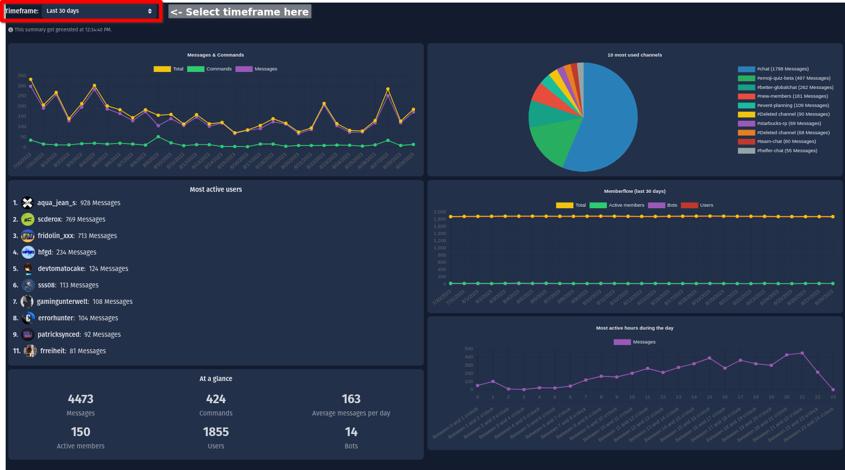 • Messages & Commands: You'll see a graph showing how many messages and commands have been sent on each day in the timeframe.